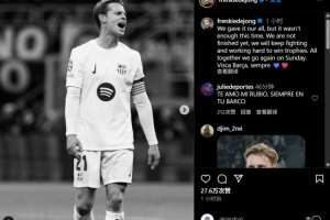 体育资讯5月8日讯 欧冠半决赛次回合,巴萨不敌国米遭淘汰,巴萨中场德容更新社媒谈自己的感受。