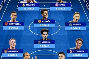 前锋:姆巴佩(皇马,13球)、凯恩(拜仁,8球)